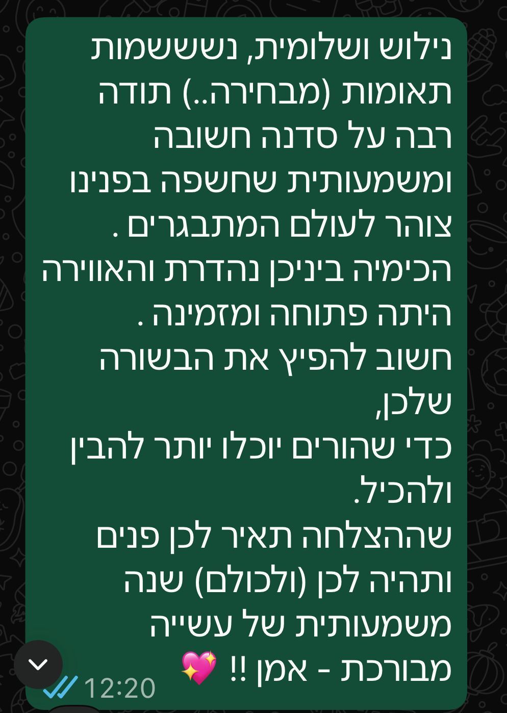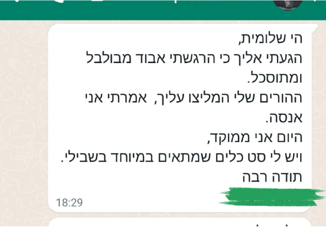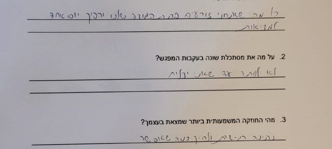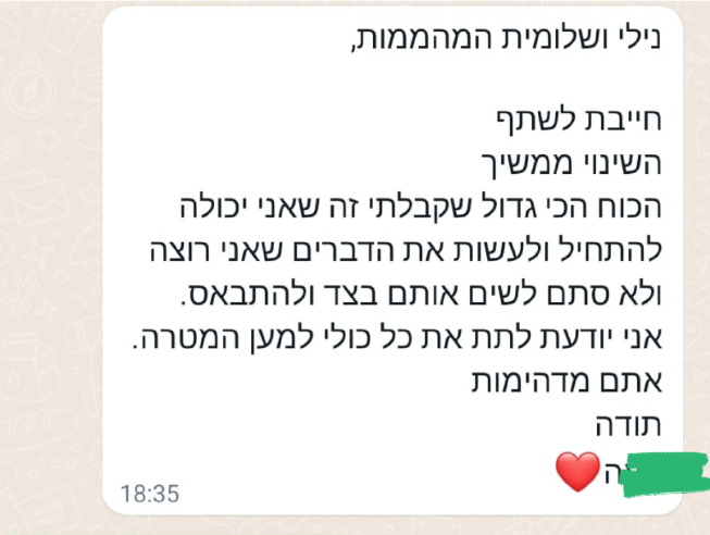 שלומית ונילי היקרות, הגעתן להעביר לנו סדנה ומהרגע הראשון הרגשנו את האהבה שלכן, את האכפתיות שבה אתן עושות את הדברים. הבנות הרגישו את הכנות, הדרך האמיתית שבה הגעתן והגיבו בהתאם. הן מצאו את החוזקות שלהן ואין ספק שההקשבה, הסבלנות והנועם שלכן עזרו להן למצוא אותן. תודה!