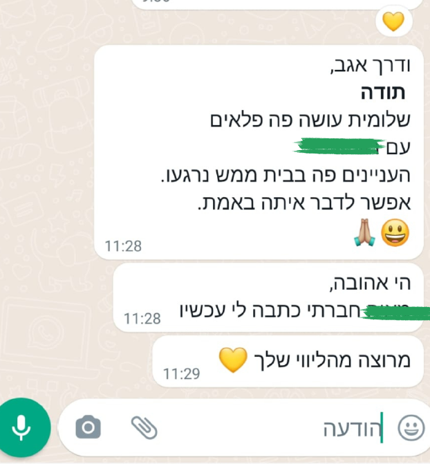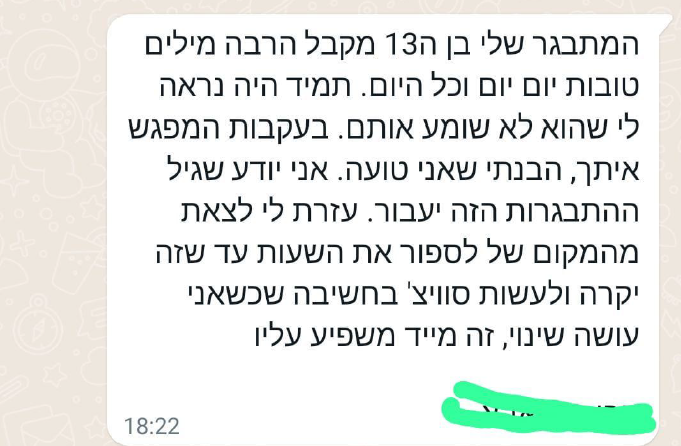 המתבגר שלי מקבל הרבה מילים טובות יום יום וכל היום. תמיד היה נראה לי שהוא לא שומע אותם. בעקבות המפגש איתך, הבנתי שאני טועה. אני יודע שגיל ההתבגרות הזה יעבור. עזרת לי לצאת מהמקום של לספור את השעות עד שזה יקרה ולעשות סוויצ' בחשיבה שכשאני עושה שינוי, זה מייד משפיע עליו